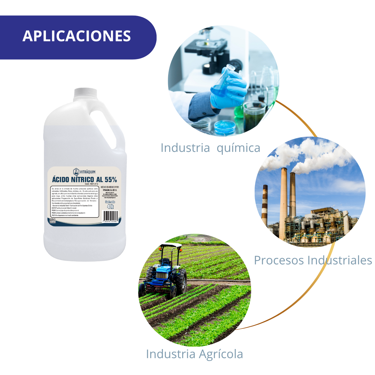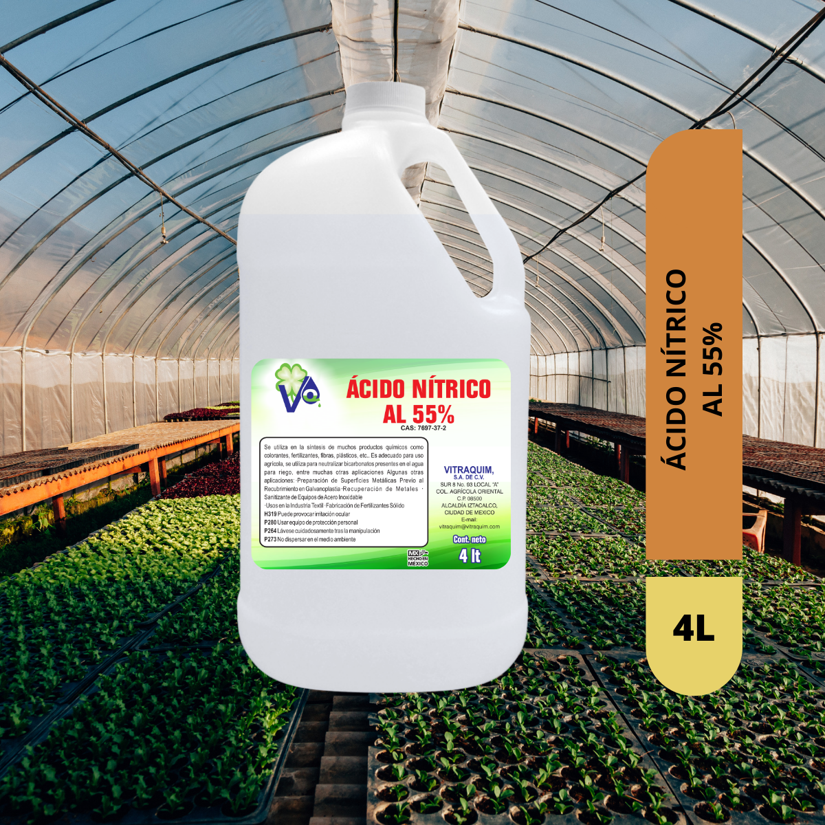 El Ácido Nítrico 55% es un coadyuvante en el tratamiento del agua de riego y regulador del pH. Este producto es clarificado, lo que significa que pasó por un proceso de purificación para eliminar metales pesados. La aplicación de este producto se realiza para prevenir el taponamiento en los goteros y mejorar la calidad de las aguas duras, ya que al acidificar se descomponen los bicarbonatos presentes, evitando así la formación de compuestos insolubles de calcio y magnesio, principalmente. Aporta nitrógeno en su forma de nitrato (NO3) siendo indispensable considerar el aporte nutrimental, especialmente cuando la necesidad de dosificación es elevada en sistemas hidropónicos abiertos y recirculantes.