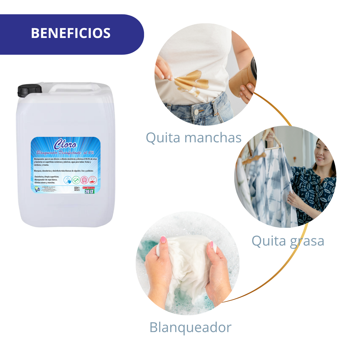 Blanqueador, que en uso directo o diluido desinfecta y elimina el 99.9% de virus y bacterias en superficies cerámicas y plásticas, agua para beber, frutas y verduras, y trastes.