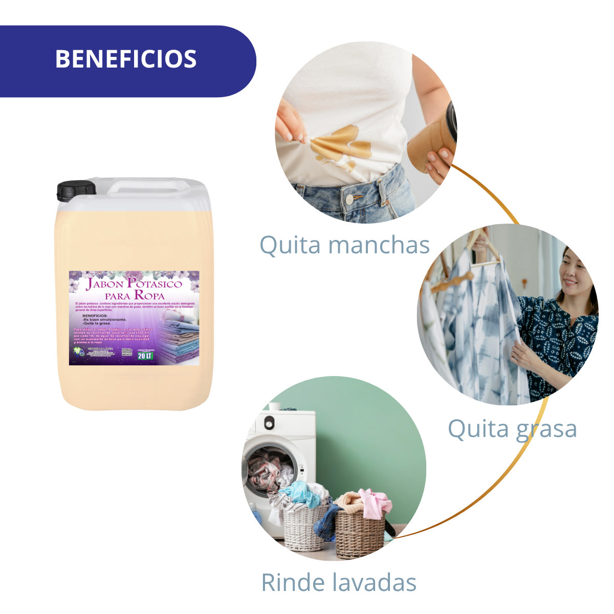 El jabón potásico contiene ingredientes que proporcionan una excelente acción detergente sobre los tejidos de la ropa con manchas de grasa, también es buen auxiliar en la limpieza general de otras superficies.