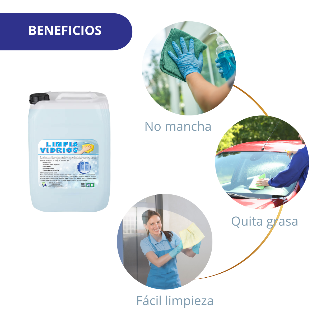 El limpiador para vidrios contiene ingredientes que ayudan a la limpieza de mugre y grasas más comunes de vidrios, espejos, cristales del hogar y del automóvil, así como de cubiertas plásticas del equipo de cómputo, teléfonos, etc.