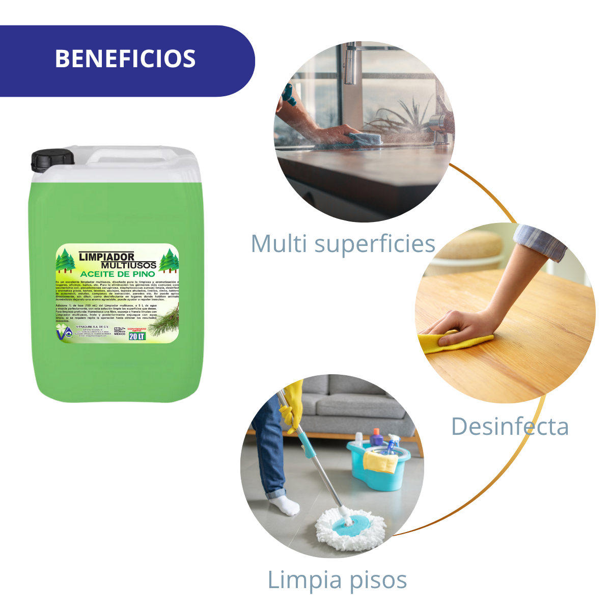 Es un excelente limpiador multiusos, diseñado para la limpieza y aromatización de hogares, oficinas, baños, etc. Para la eliminación los gérmenes más comunes como (escherichia coli, pseudomonas aeruginosa, staphylococcus aureus) limpia, desinfecta y aromatiza pisos, baños, lavabos, azulejos, tapices ahulados, linóleo, vinilo, tableros de automóvil, estufas, campanas de extracción, paredes etc. Se puede aplicar directamente, sin diluir, como desinfectante en lugares donde habiten animales domésticos dejando una aroma agradable, puede ayudar a repeler insectos.