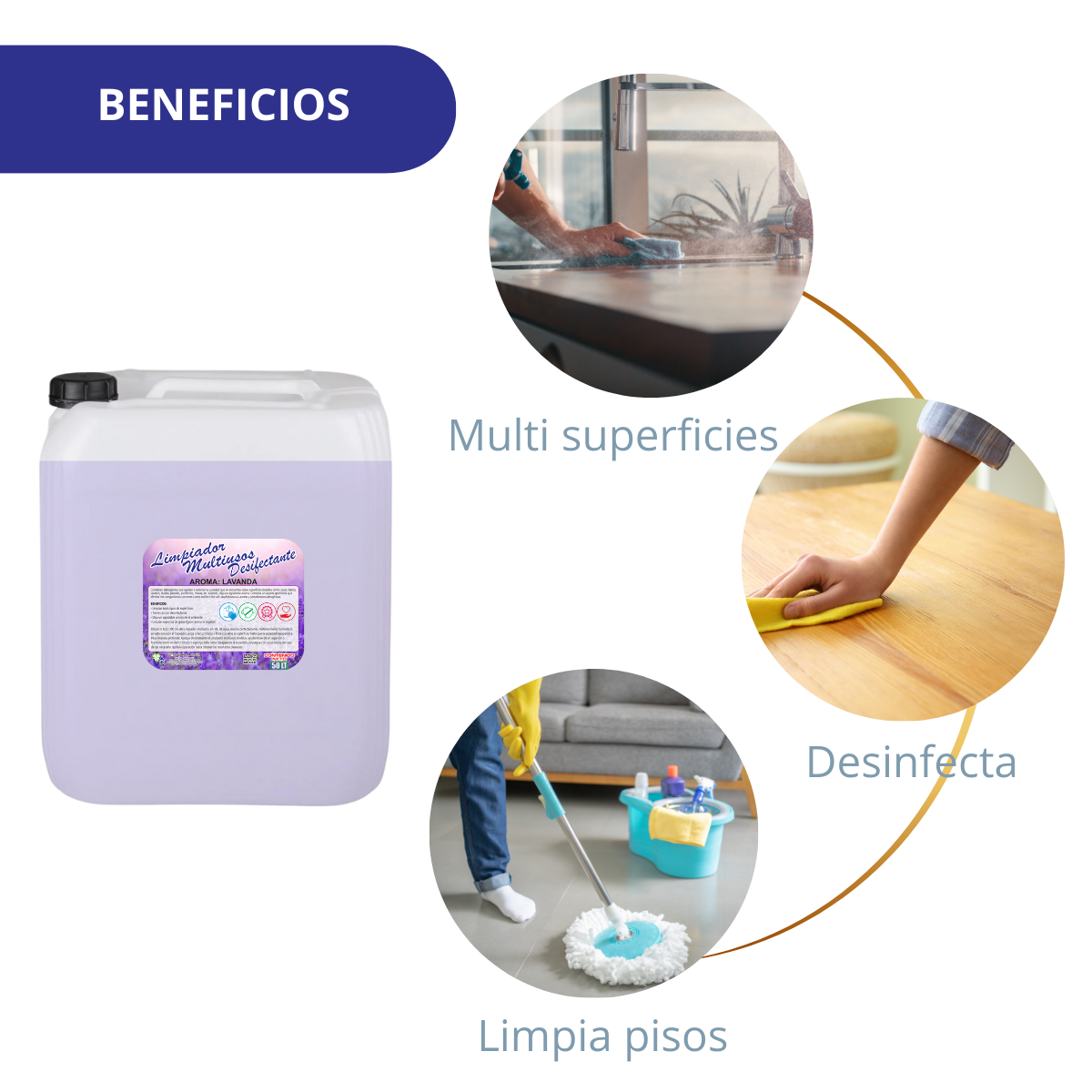 Limpiador multiusos desinfectante aroma Lavanda contienen un agente germicida, además de brindar un agradable aroma en el ambiente y lugares donde se aplique.