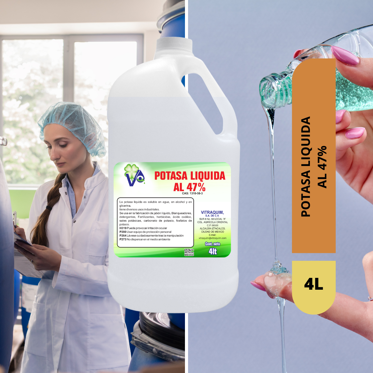 Se usa en la fabricación de jabón líquido, Blanqueadores, detergentes, Fertilizantes, herbicidas, ácido oxálico, sales potásicas, carbonato de potasio, fosfatos de potasio