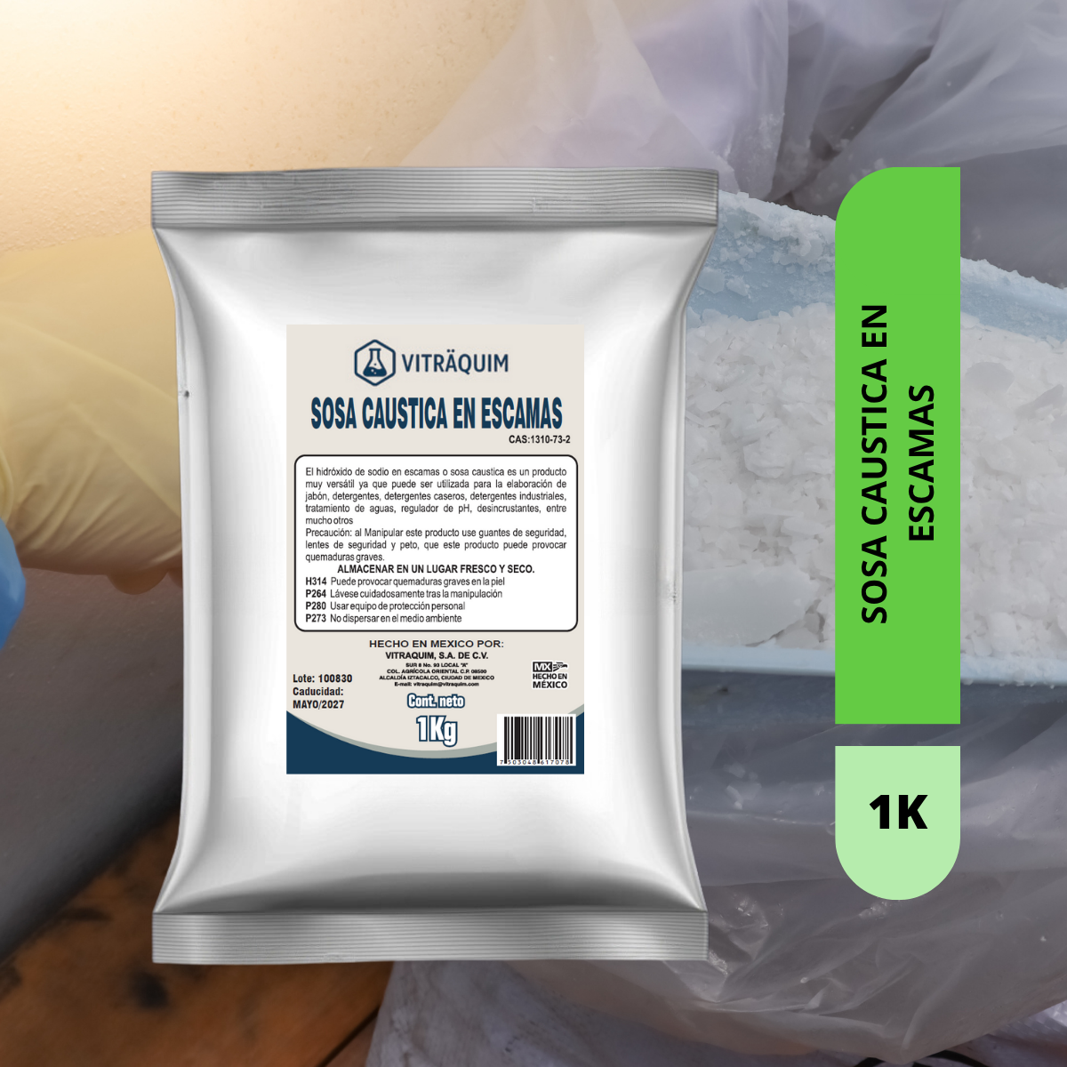 Sosa escamas de la marca Vitraquim es ideal para la fabricación de detergente que quiten manchas difíciles en tu ropa. Con un peso neto de 4 kilos en escamas. El envase de bolsa metalizada garantiza la conservación del producto por más tiempo.