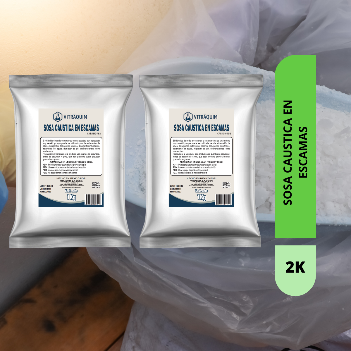 Sosa escamas de la marca Vitraquim es ideal para la fabricación de detergente que quiten manchas difíciles en tu ropa. Con un peso neto de 4 kilos en escamas. El envase de bolsa metalizada garantiza la conservación del producto por más tiempo.